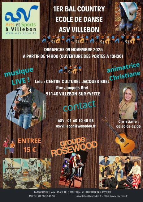DIAMNCHE 09 NOVEMBRE BAL COUNTRY AVEC CONCERT DU GROUPE LES ROSWOOD à VILLEBON SUR YVETTE ORGANISE PAR L'ECOLE DE DANSE ASV VILLEBON